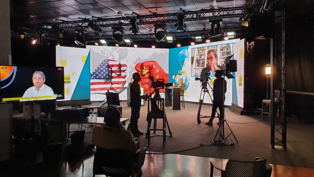 En partenariat avec le Groupe NOVELTY, nous proposons 2 STUDIOS pour organiser des événements digitaux type plateau TV, entièrement PERSONNALISABLES et MODULABLES selon vos besoins.